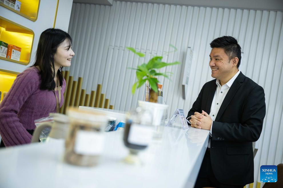 Wong Chi Choi, a young man from Macao, talks with a colleague in Authenmole (Hengqin Zhuhai) Traditional Chinese Medicine Health Industry Development Co., Ltd. he works in, in Hengqin of Zhuhai city, south China's Guangdong Province, Dec. 11, 2024. (Xinhua/Cheong Kam Ka)
