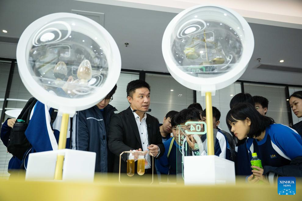 Wong Chi Choi, a young man from Macao, communicates with the students from Lou Hau High School of Macao in an exhibition hall of Authenmole (Hengqin Zhuhai) Traditional Chinese Medicine Health Industry Development Co., Ltd. he works in, in Hengqin of Zhuhai city, south China's Guangdong Province, Dec. 11, 2024. (Xinhua/Cheong Kam Ka)