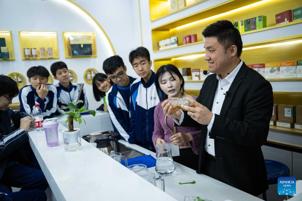 Wong Chi Choi, a young man from Macao, talks in an exhibition hall of Authenmole (Hengqin Zhuhai) Traditional Chinese Medicine Health Industry Development Co., Ltd. he works in to the students from Lou Hau High School of Macao, in Hengqin of Zhuhai city, south China's Guangdong Province, Dec. 11, 2024. (Xinhua/Cheong Kam Ka)