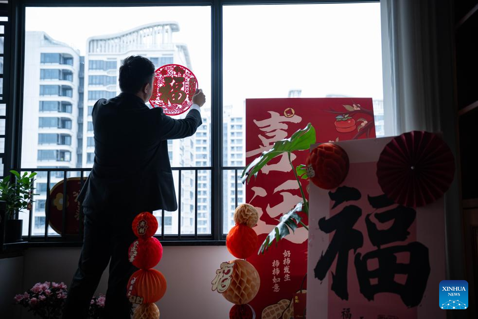 Wong Chi Choi, a young man from Macao, posts the Chinese character "fu" (meaning happiness, blessing, and good fortune) at his new home in the Macao New Neighborhood in Hengqin of Zhuhai city, south China's Guangdong Province, Dec. 11, 2024. (Xinhua/Cheong Kam Ka)