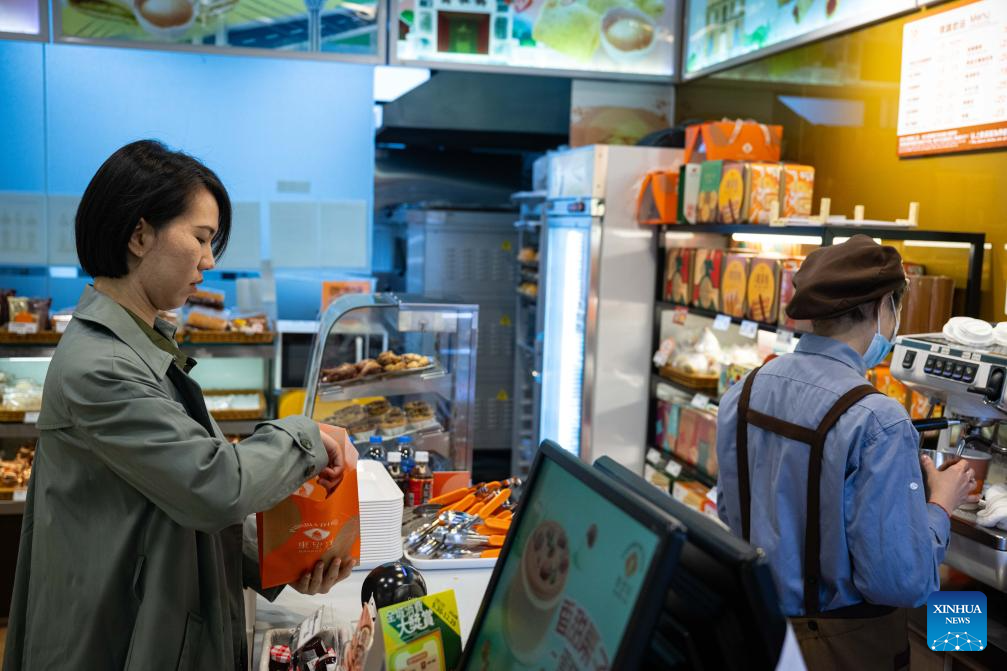Su Baijing, wife of Wong Chi Choi, a young man from Macao, buys breakfast in the Hengqin Campus of the University of Macao, in Hengqin of Zhuhai city, south China's Guangdong Province, Dec. 11, 2024. (Xinhua/Cheong Kam Ka)