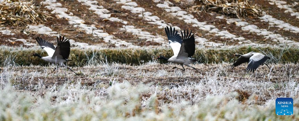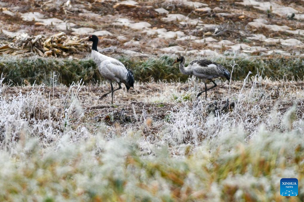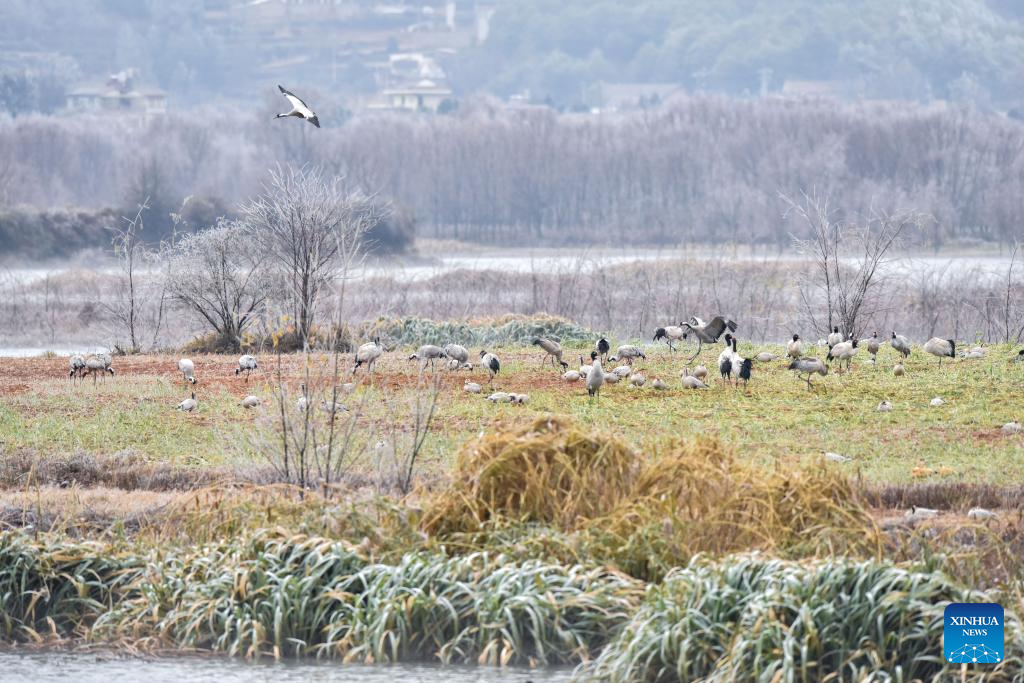 Black-necked cranes are pictured at the National Nature Reserve of Black-necked Cranes in Huize County of Qujing City, southwest China's Yunnan Province, Dec. 14, 2024. A large number of migratory birds, including more than 1,000 black-necked cranes, flied to the reserve for wintering. (Xinhua/Wang Jingyi)