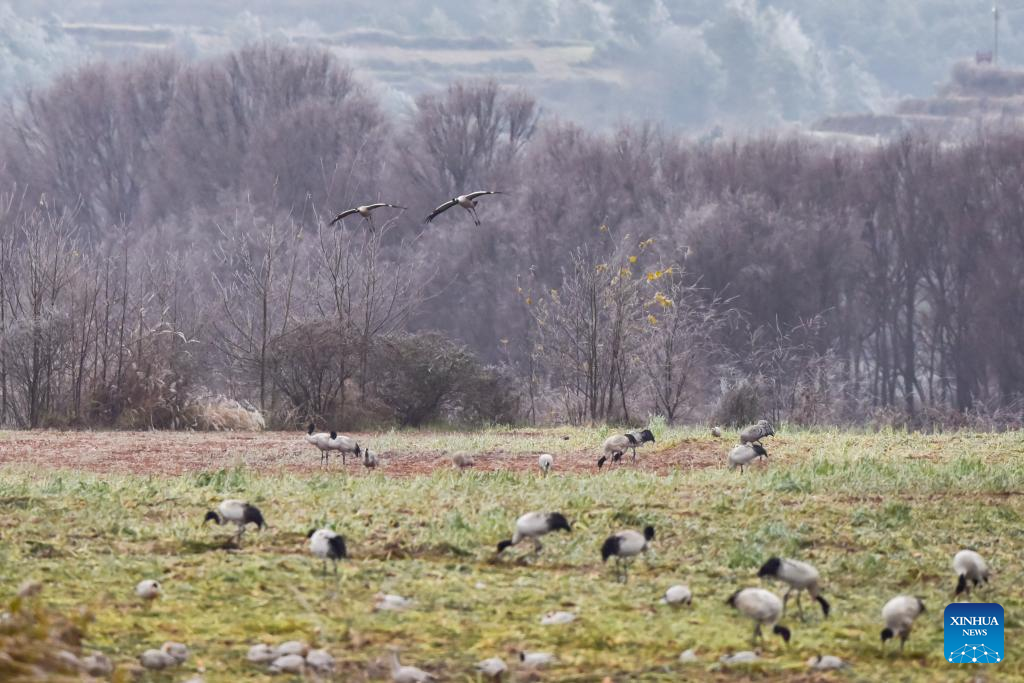 A flock of cranes forage at the National Nature Reserve of Black-necked Cranes in Huize County of Qujing City, southwest China's Yunnan Province, Dec. 14, 2024. A large number of migratory birds, including more than 1,000 black-necked cranes, flied to the reserve for wintering. (Xinhua/Wang Jingyi)