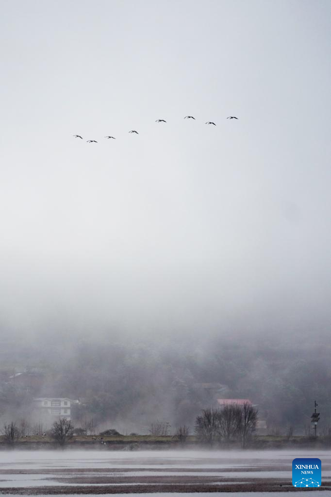 A flock of black-necked cranes fly over the National Nature Reserve of Black-necked Cranes in Huize County of Qujing City, southwest China's Yunnan Province, Dec. 14, 2024. A large number of migratory birds, including more than 1,000 black-necked cranes, flied to the reserve for wintering. (Xinhua/Wang Jingyi)