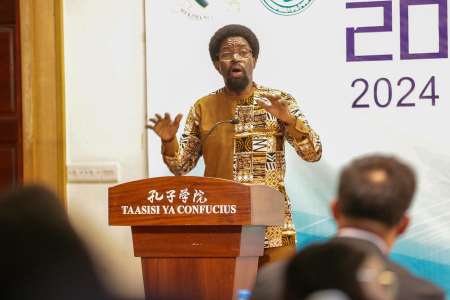 Aldin Mutembei, the Tanzanian director of the Confucius Institute at the University of Dar es Salaam, delivers a speech at the opening ceremony of a workshop at the Confucius Institute at the University of Dar es Salaam in Tanzania, Dec. 14, 2024. (Xinhua/Emmanuel Herman)