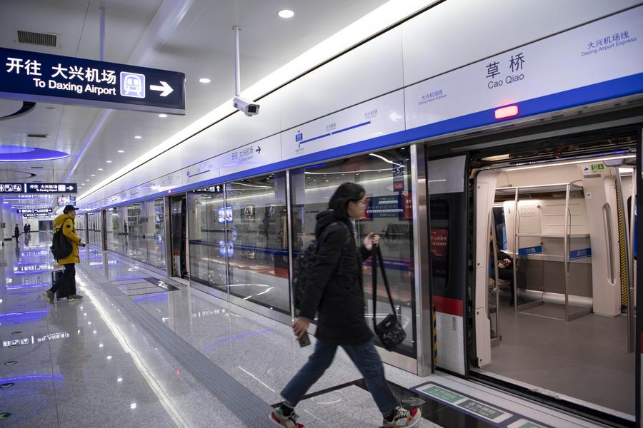 BEIJING, Dec. 14 (Xinhua) -- On a typical weekday in December, away from the rush hour crowds, a batch of aviation documents was loaded into the luggage compartment of the Beijing Daxing Airport subway line. In the passenger cabin ahead, a few commuters quietly sat, scrolling through their phones.