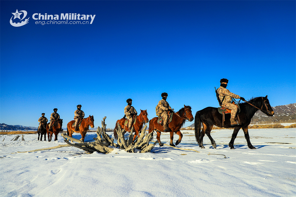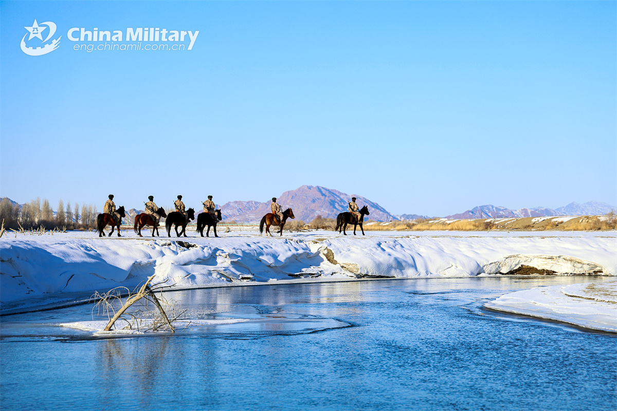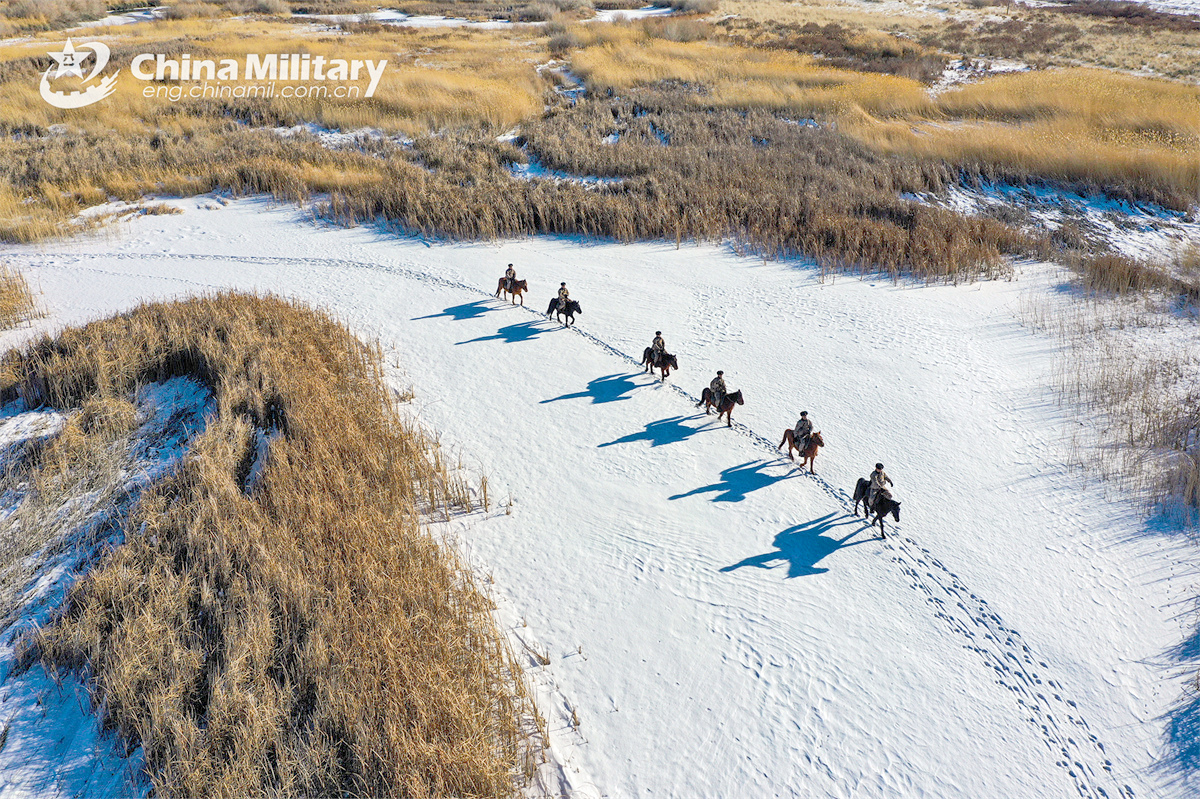 Soldiers assigned to the Takixken border defense company under the Chinese PLA Xinjiang Military Command carefully steer their horses to pass through snow-covered wetland during a routine patrol mission on November 29, 2024. (eng.chinamil.com.cn/Photo by Xiao Guotao)