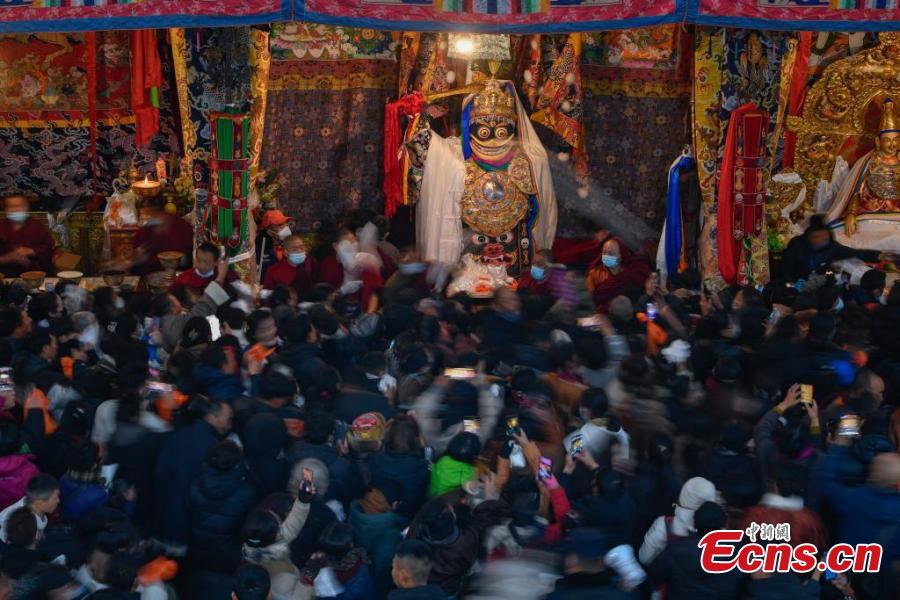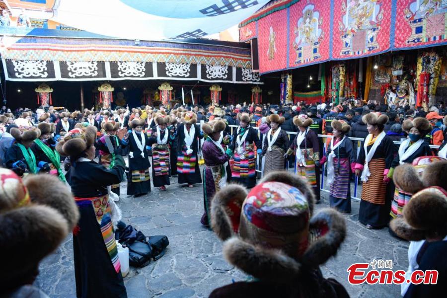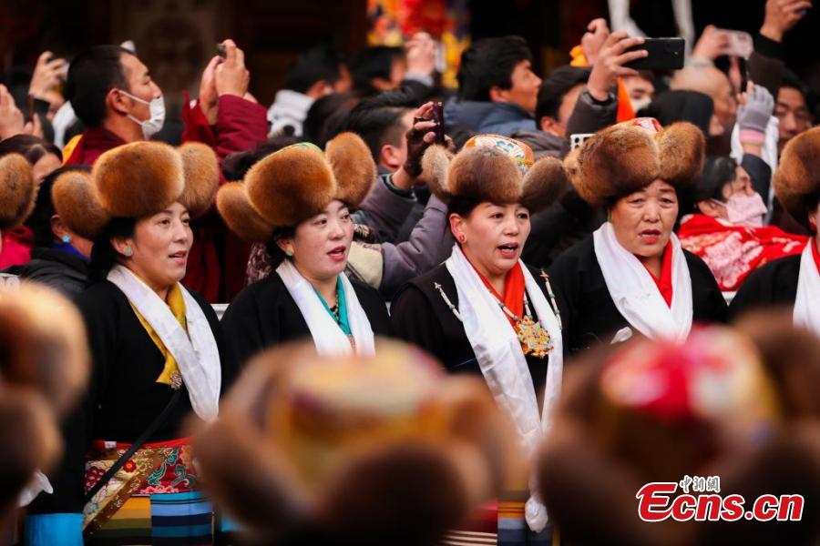 Women of the Tibetan ethnic group dance to celebrate the Fairy's Day celebration in front of the Jokhang Temple in Lhasa, southwest China's Xizang Autonomous Region, Dec. 15, 2024. (Photo/China News Service)