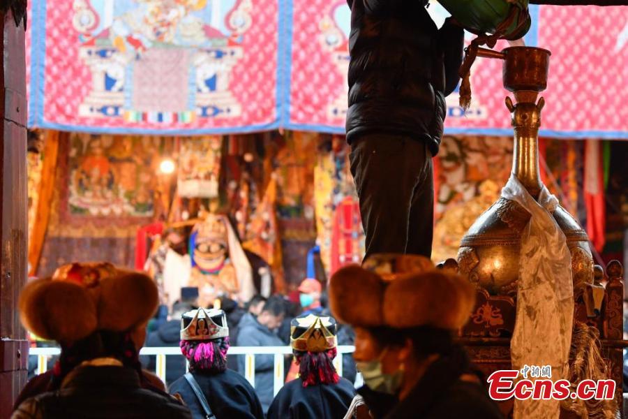 Women of the Tibetan ethnic group drink highland barley wine to celebrate the Fairy's Day at the Jokhang Temple in Lhasa, southwest China's Xizang Autonomous Region, Dec. 15, 2024. (Photo/China News Service)