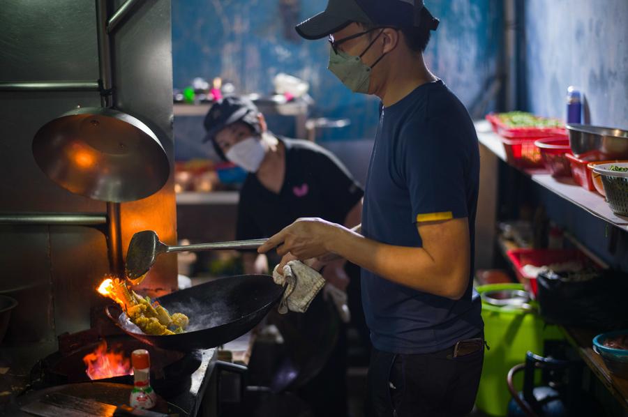 A worker cooks at a "Dai Pai Dong" street food stall in south China's Macao, Dec. 8, 2024. (Xinhua/Cheong Kam Ka)