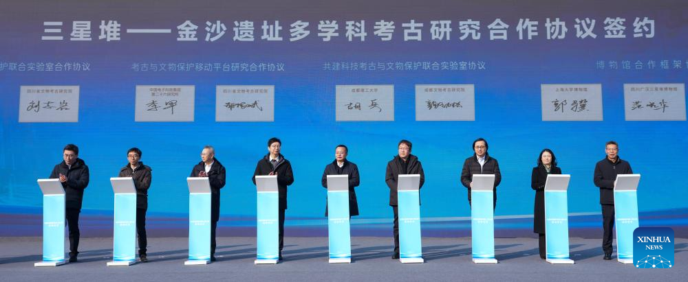 Representatives of archaeological experts sign a cooperation agreement on a multidisciplinary archaeological research on Sanxingdui and Jinsha ruins in Guanghan City, southwest China's Sichuan Province, Dec. 16, 2024. The second phase of the conservation and inheritance project of Ancient Shu Civilization was launched here on Monday. In the next three years, excavations and researches will be organized to explore the uncharted territories in the functional areas and important relics of Sanxingdui and Jinsha ruins. Jinsha ruins, together with the Sanxingdui ruins, are peaks of ancient Shu culture and represent the two most glorious periods of the ancient Shu Kingdom that suddenly disappeared about 2,000 years ago. (Xinhua/Jiang Hongjing)