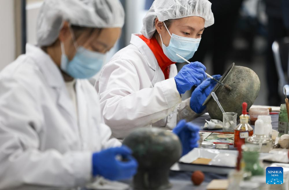 Staff members restore a bronze relic at a research institute of Sanxingdui ruins in Guanghan City, southwest China's Sichuan Province, Dec. 16, 2024. The second phase of the conservation and inheritance project of Ancient Shu Civilization was launched here on Monday. In the next three years, excavations and researches will be organized to explore the uncharted territories in the functional areas and important relics of Sanxingdui and Jinsha ruins. Jinsha ruins, together with the Sanxingdui ruins, are peaks of ancient Shu culture and represent the two most glorious periods of the ancient Shu Kingdom that suddenly disappeared about 2,000 years ago. (Xinhua/Jiang Hongjing)