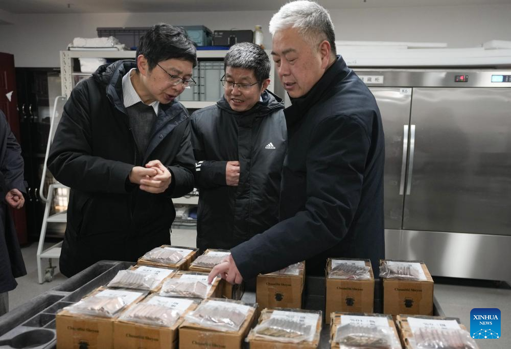 Archaeologists examine samples of bronze pieces with different alloy proportions at a research institute of Sanxingdui ruins in Guanghan City, southwest China's Sichuan Province, Dec. 16, 2024. The second phase of the conservation and inheritance project of Ancient Shu Civilization was launched here on Monday. In the next three years, excavations and researches will be organized to explore the uncharted territories in the functional areas and important relics of Sanxingdui and Jinsha ruins. Jinsha ruins, together with the Sanxingdui ruins, are peaks of ancient Shu culture and represent the two most glorious periods of the ancient Shu Kingdom that suddenly disappeared about 2,000 years ago. (Xinhua/Jiang Hongjing)