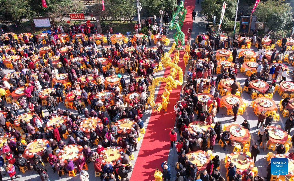A drone photo taken on Dec. 16, 2024 shows villagers and tourists watching a dragon dance during a folk festival in Houwu Village of Moganshan Town, Deqing County, east China's Zhejiang Province. The folk festival was celebrated here on Monday with various activities to welcome the new year. (Photo by Xie Shangguo/Xinhua)