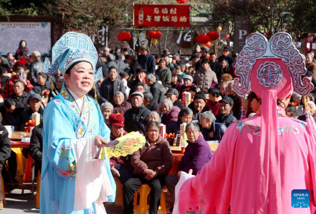 Villagers watch an opera performance during a folk festival in Houwu Village of Moganshan Town, Deqing County, east China's Zhejiang Province on Dec. 16, 2024. The folk festival was celebrated here on Monday with various activities to welcome the new year. (Photo by Xie Shangguo/Xinhua)