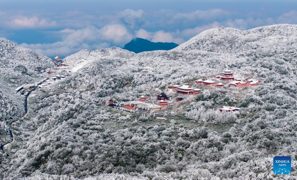 An aerial drone photo taken on Dec. 15, 2024 shows the snow-covered Jinfo Mountain in Nanchuan District, southwest China's Chongqing Municipality. (Photo by Gan Haomin/Xinhua)