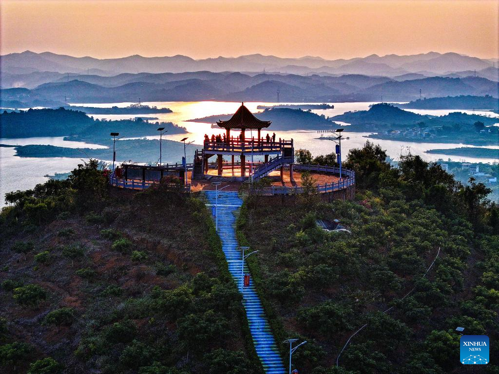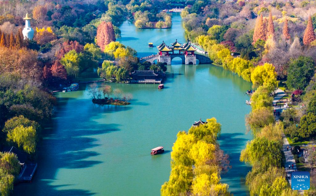 An aerial drone photo taken on Dec. 16, 2024 shows tourists visiting the Slender West Lake scenic spot in Yangzhou, east China's Jiangsu Province. (Photo by Zhou Shegen/Xinhua)