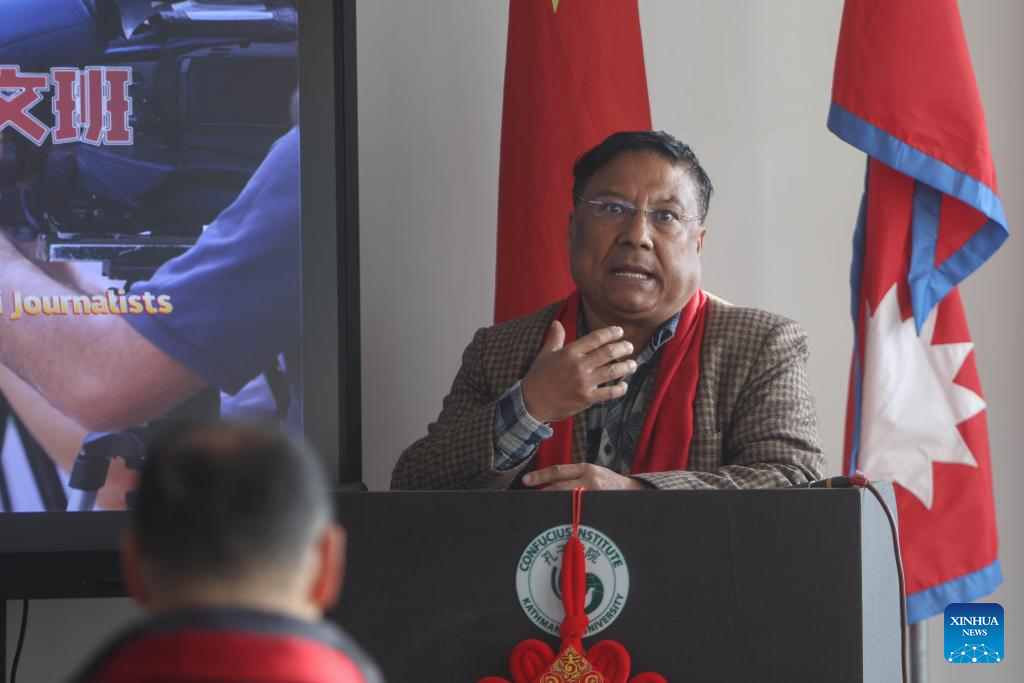 Kishor Shrestha, chairman of the Nepal-China Media Forum, speaks at the opening ceremony of a Chinese class for Nepalese journalists at the Confucius Institute in Lalitpur, Nepal, Dec. 16, 2024. The Chinese class was relaunched on Monday for 40 Nepalese journalists from different media outlets. (Photo by Sulav Shrestha/Xinhua)