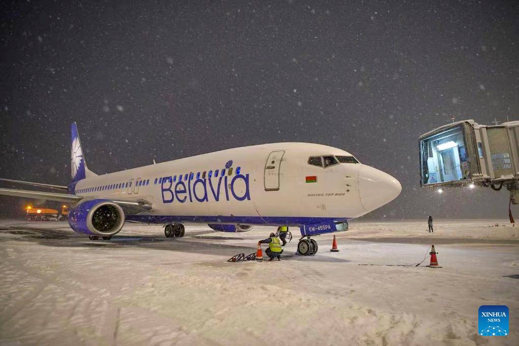 Flight B2752 of Belavia Belarusian Airlines is pictured at Urumqi Diwopu International Airport in Urumqi, northwest China's Xinjiang Uygur Autonomous Region, Dec. 16, 2024. (Xinhua)