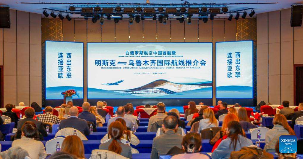 A promotion meeting on a new air route linking Urumqi, capital of northwest China's Xinjiang Uygur Autonomous Region, and Minsk, capital of Belarus, is held in Urumqi, northwest China's Xinjiang Uygur Autonomous Region, Dec. 17, 2024. (Xinhua/Chen Shuo)