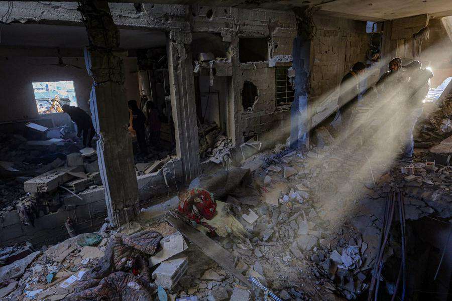 People are seen inside a building destroyed in an Israeli airstrike in al-Nuseirat refugee camp, central Gaza Strip, on Dec. 16, 2024. (Photo by Rizek Abdeljawad/Xinhua)