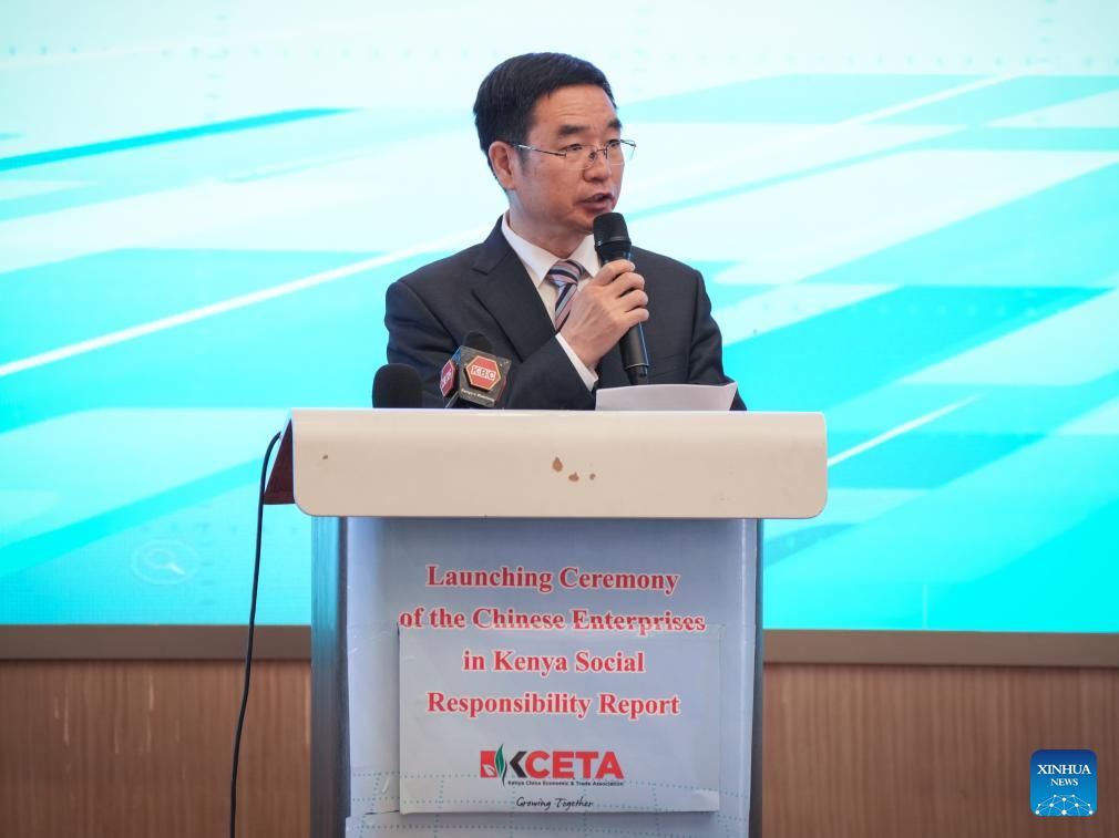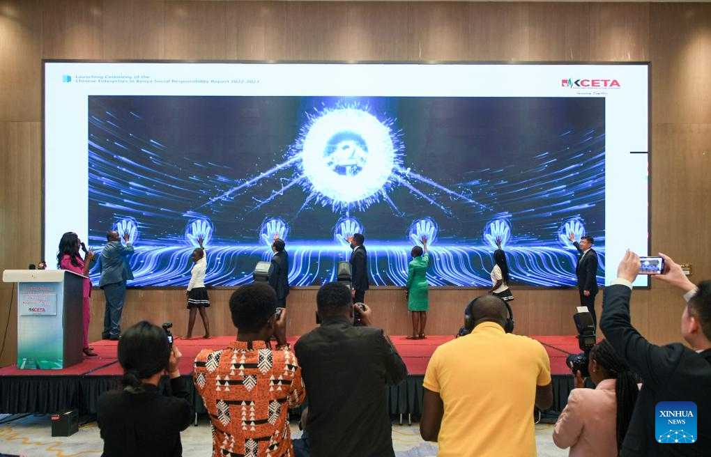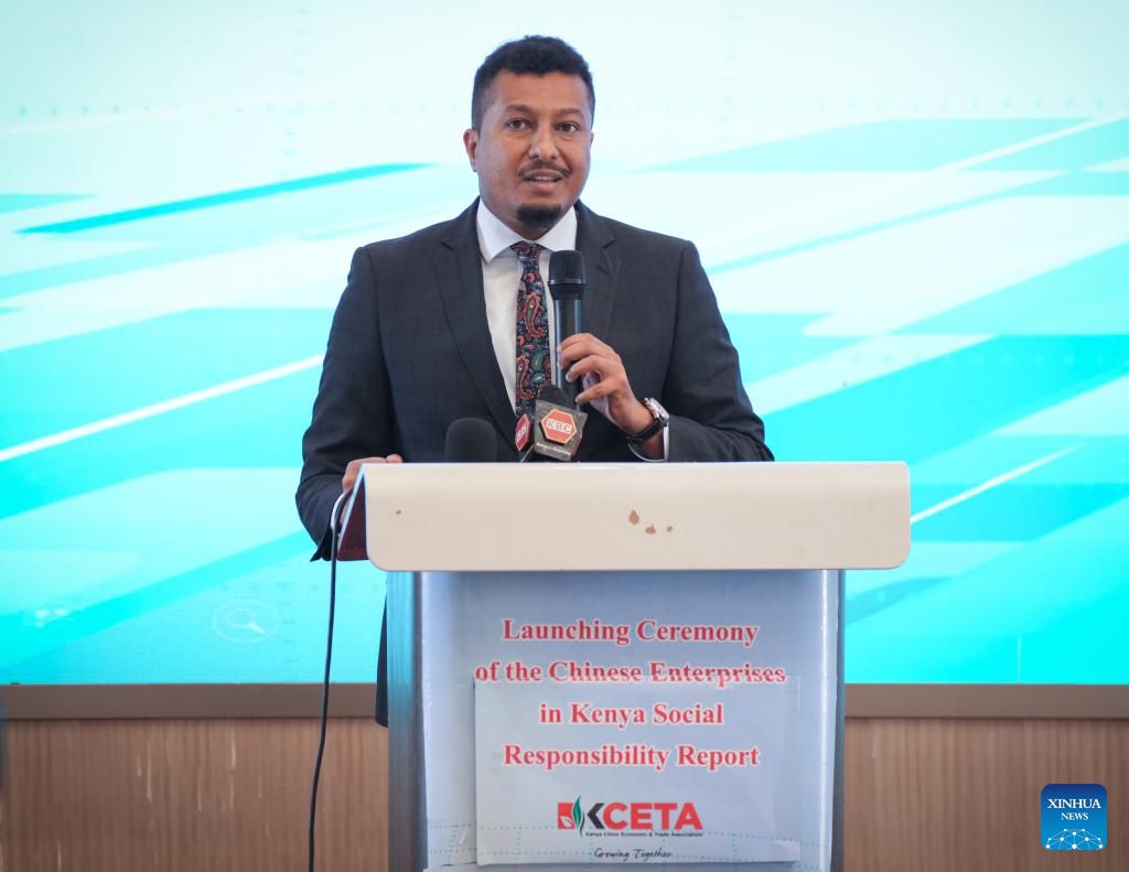 A launching ceremony of the Chinese Enterprises in Kenya Social Responsibility Report is held in Nairobi, Kenya, on Dec. 17, 2024. Kenya's quest for green development, modernization and skills upgrade has borne fruits, driven by the proactive involvement of Chinese firms operating in the country, according to a report launched Tuesday in Nairobi. In its fourth edition, the Corporate Social Responsibility (CSR) report compiled by the Kenya China Economic and Trade Association (KCETA) covering 2022-2023, said that these companies have rallied behind Kenya's long-term growth and transformation agenda. (Xinhua/Li Yahui)