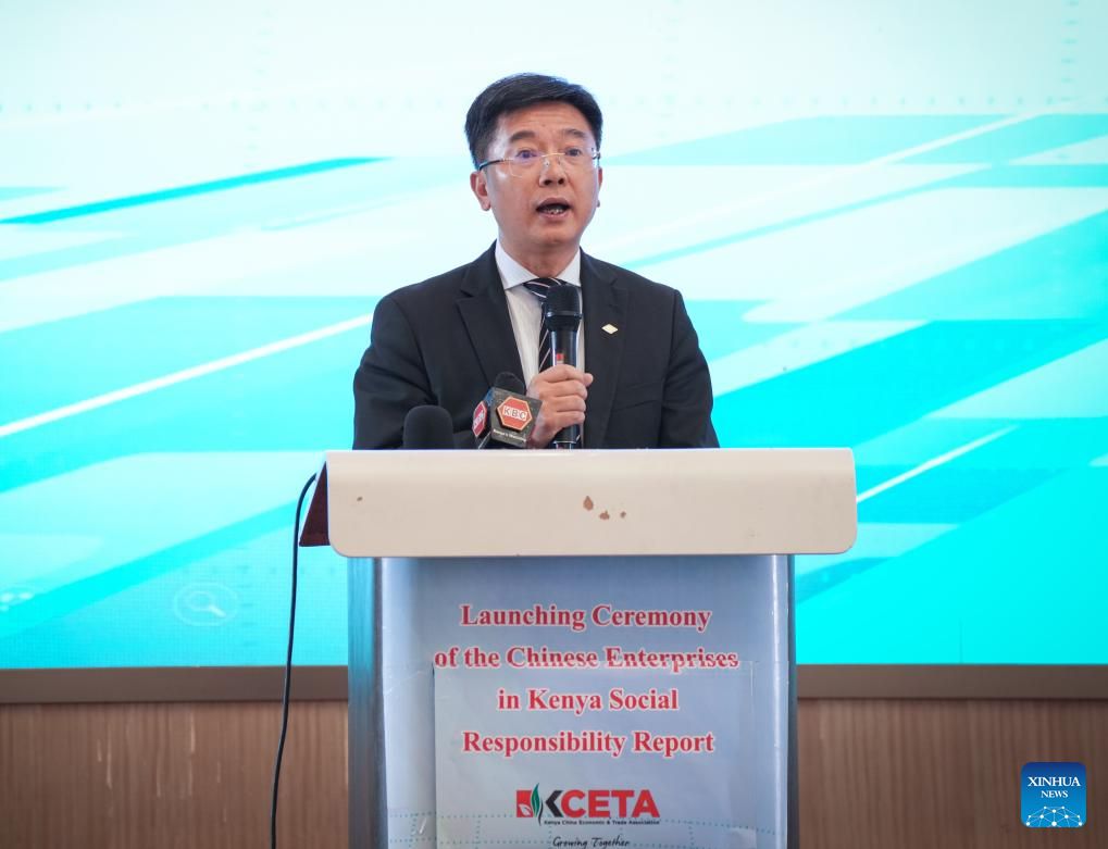Liu Chenghui, chairman of the Kenya China Economic and Trade Association (KCETA) and deputy general manager of the China Road and Bridge Corporation Kenya Head Office, speaks during a launching ceremony of the Chinese Enterprises in Kenya Social Responsibility Report in Nairobi, Kenya, on Dec. 17, 2024. Kenya's quest for green development, modernization and skills upgrade has borne fruits, driven by the proactive involvement of Chinese firms operating in the country, according to a report launched Tuesday in Nairobi. In its fourth edition, the Corporate Social Responsibility (CSR) report compiled by the Kenya China Economic and Trade Association (KCETA) covering 2022-2023, said that these companies have rallied behind Kenya's long-term growth and transformation agenda. (Xinhua/Li Yahui)