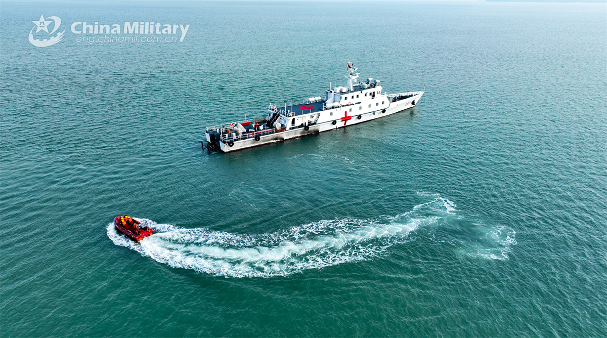 A hospital ship and a speed boat attached to a service ship group with the navy under the Chinese PLA Eastern Theater Command maneuver at sea during a maritime search and rescue training exercise in late November 2024. (eng.chinamil.com.cn/Photo by Chu Chengtao)