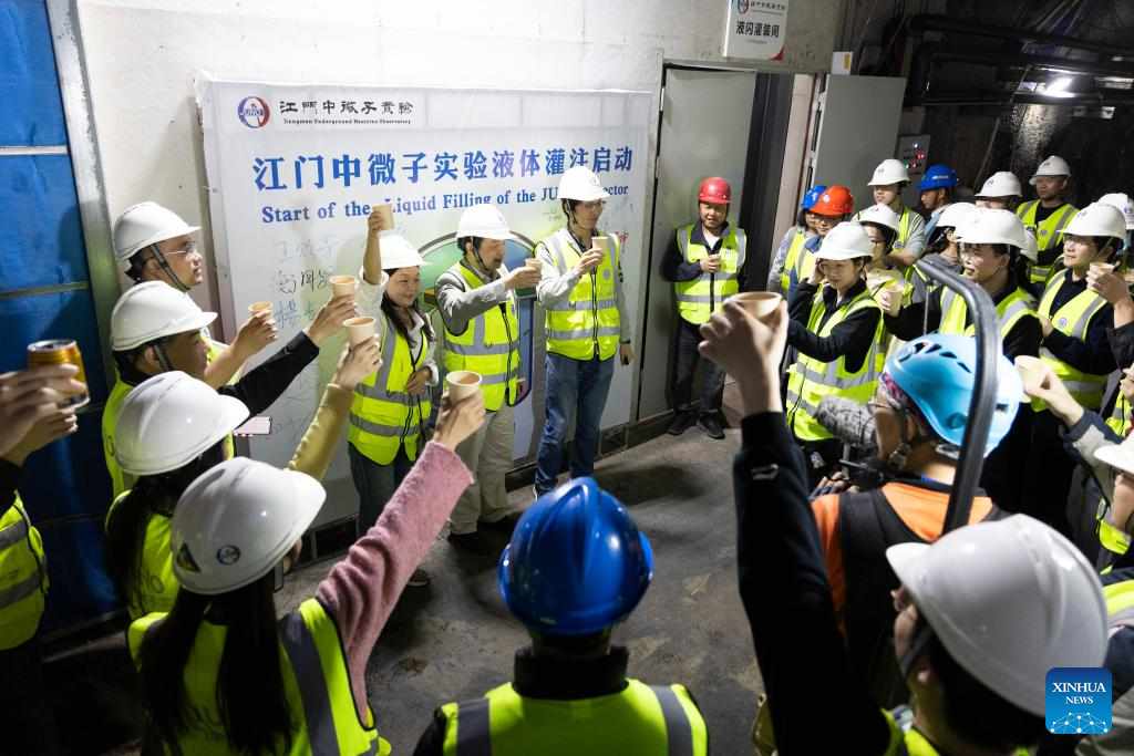 Researchers make a toast to mark the start of liquid filling at the Jiangmen Underground Neutrino Observatory (JUNO) in Jiangmen, south China's Guangdong Province, Dec. 18, 2024. The liquid filling of the central detector of JUNO started on Wednesday. As one of the world's most powerful experiments to uncover neutrino mystery, JUNO is expected to operate for at least 30 years. (Xinhua/Jin Liwang)