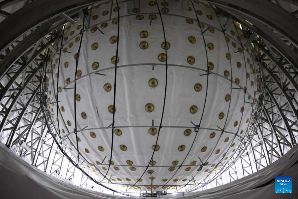 This photo taken on Dec. 16, 2024 shows the central detector of the Jiangmen Underground Neutrino Observatory (JUNO) in Jiangmen, south China's Guangdong Province. The liquid filling of the central detector of JUNO started on Wednesday. As one of the world's most powerful experiments to uncover neutrino mystery, JUNO is expected to operate for at least 30 years. (Xinhua/Jin Liwang)