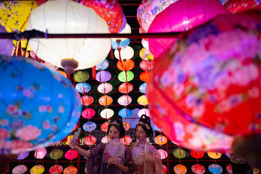 Women in traditional Chinese costumes take selfies at Mount Fortress in Macao. (Photo/Xinhua)