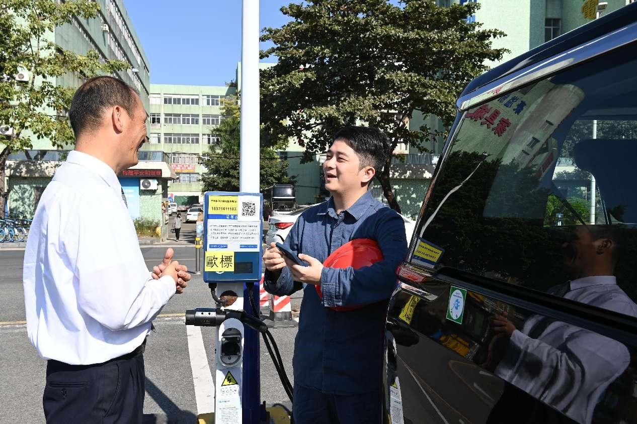 A technician helps a resident from Macao recharge his new energy vehicle in Zhuhai, south China's Guangdong province. (People's Daily Online/Zhou Zhiwang)