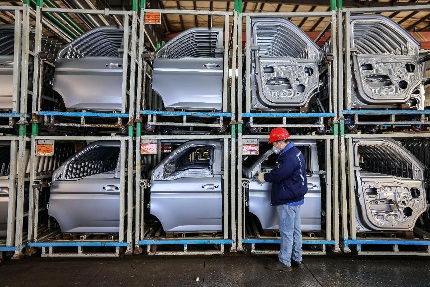 Car doors are manufactured in a workshop of an auto parts company in Qingdao, east China's Shandong province, and ready to be sent to an automobile factory, Nov. 28, 2024. (People's Daily Online/Han Jiajun)