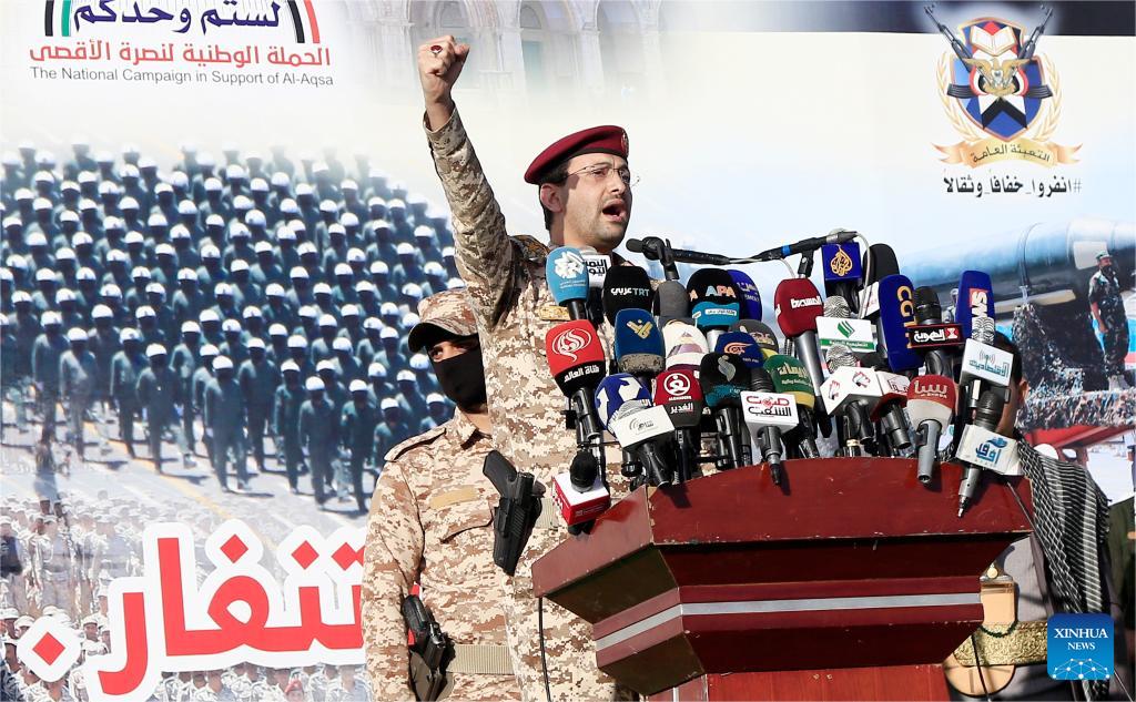 Houthi military spokesperson Yahya Sarea speaks at a rally of the Houthi supporters in Sanaa, Yemen, on Dec. 20, 2024. Yemen's Houthi group said they launched joint drone attacks with the Iraqi Resistance on Friday against "military and vital targets" in Israel. (Photo by Mohammed Mohammed/Xinhua)