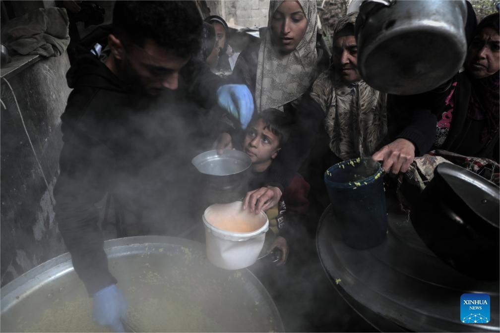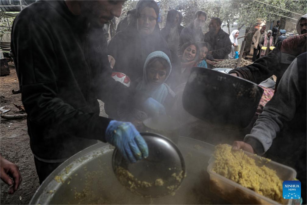 A man prepares food for people at a food distribution center in the city of Deir al-Balah, central Gaza Strip, on Dec. 20, 2024. Across the besieged coastal enclave, hunger is spreading amid severe flour shortages and reduced food distribution centers due to access constraints and insecurity. (Photo by Rizek Abdeljawad/Xinhua)