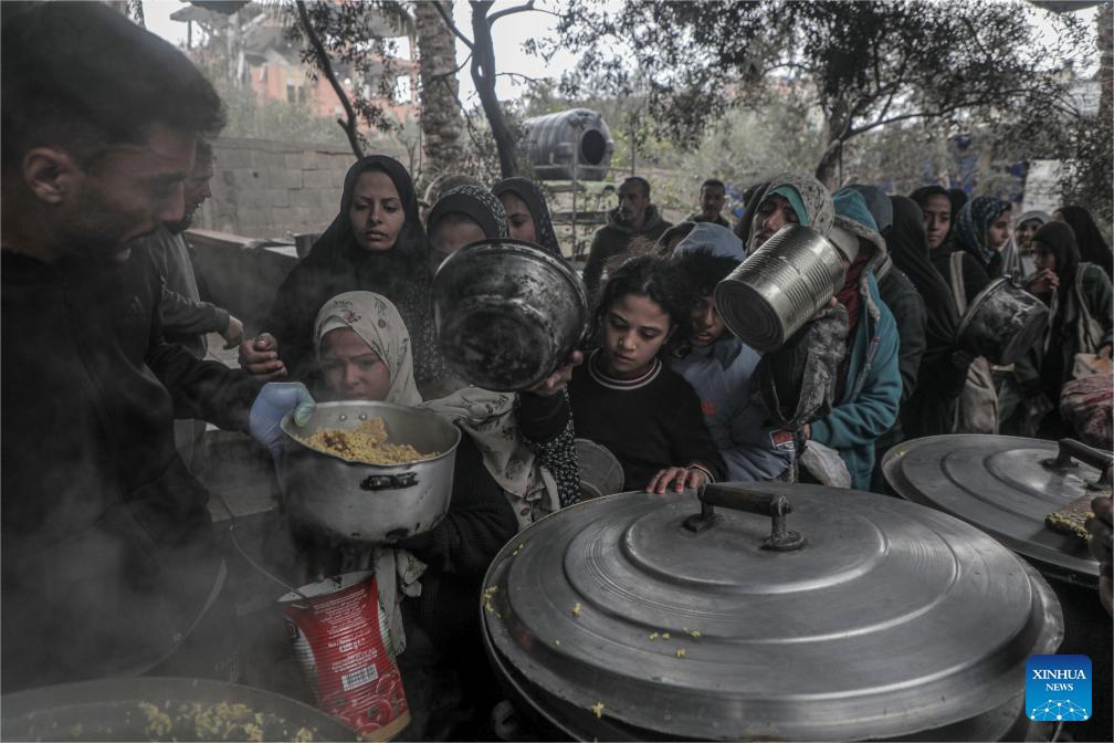 People line up to receive food relief at a food distribution center in the city of Deir al-Balah, central Gaza Strip, on Dec. 20, 2024. Across the besieged coastal enclave, hunger is spreading amid severe flour shortages and reduced food distribution centers due to access constraints and insecurity. (Photo by Rizek Abdeljawad/Xinhua)