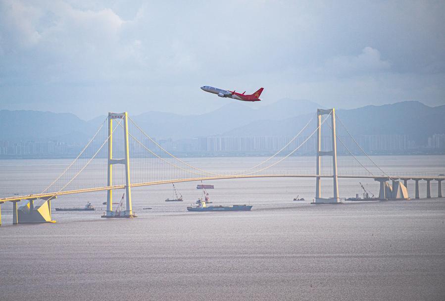 An aircraft flies over the Shenzhong Bridge of the Shenzhen-Zhongshan Link in south China's Guangdong Province, June 23, 2024. (Xinhua/Mao Siqian)
