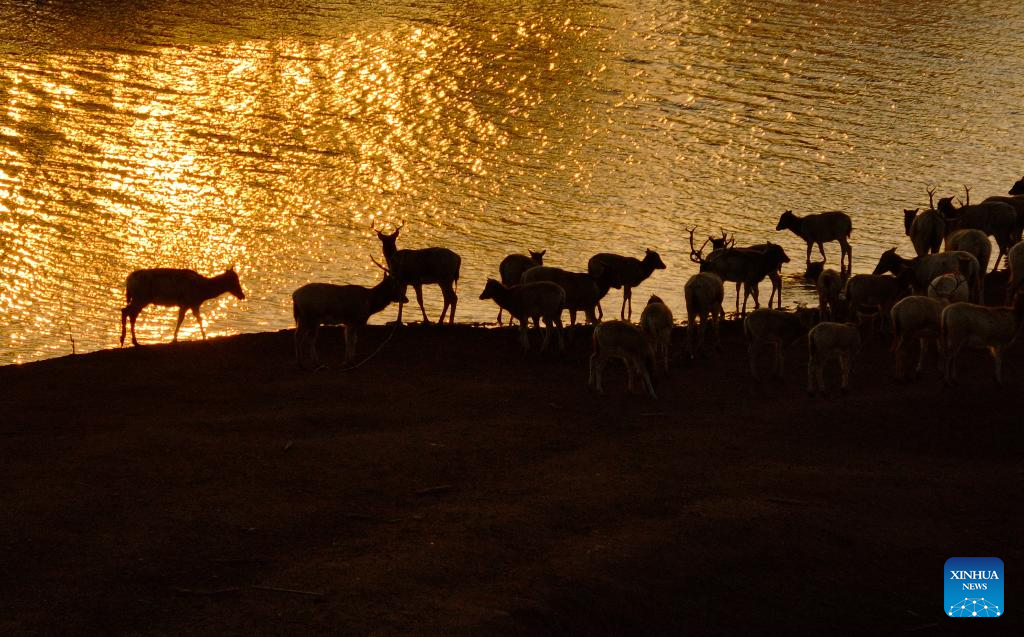 An aerial drone photo taken on Dec. 21, 2024 shows elks in Dafeng District of Yancheng City, east China's Jiangsu Province. The population of elks here has maintained a stable growth over years as the ecological environment in Dafeng District continues to improve. (Xinhua/Ji Chunpeng)