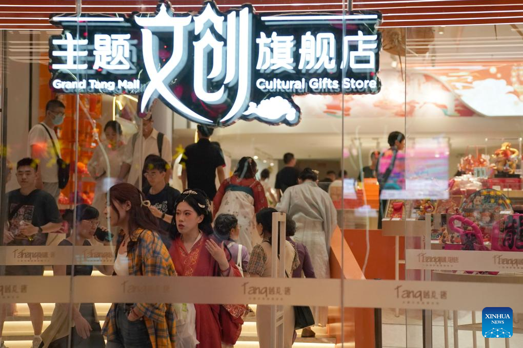 Tourists shop at a cultural gifts store of the Grand Tang Mall, a Tang Dynasty-themed pedestrian area, in Xi'an, northwest China's Shaanxi Province, May 20, 2024. Xi'an, also known as Chang'an in ancient times, has a history stretching back over 3,100 years. Boasting world-famous sites such as the Terracotta Warriors, Xi'an served as the capital for 13 dynasties over the course of China's history. Today, tradition and modernity are intertwined in Xi'an, and its history is embedded within the hustle and bustle of urban life. (Xinhua/Shao Rui)