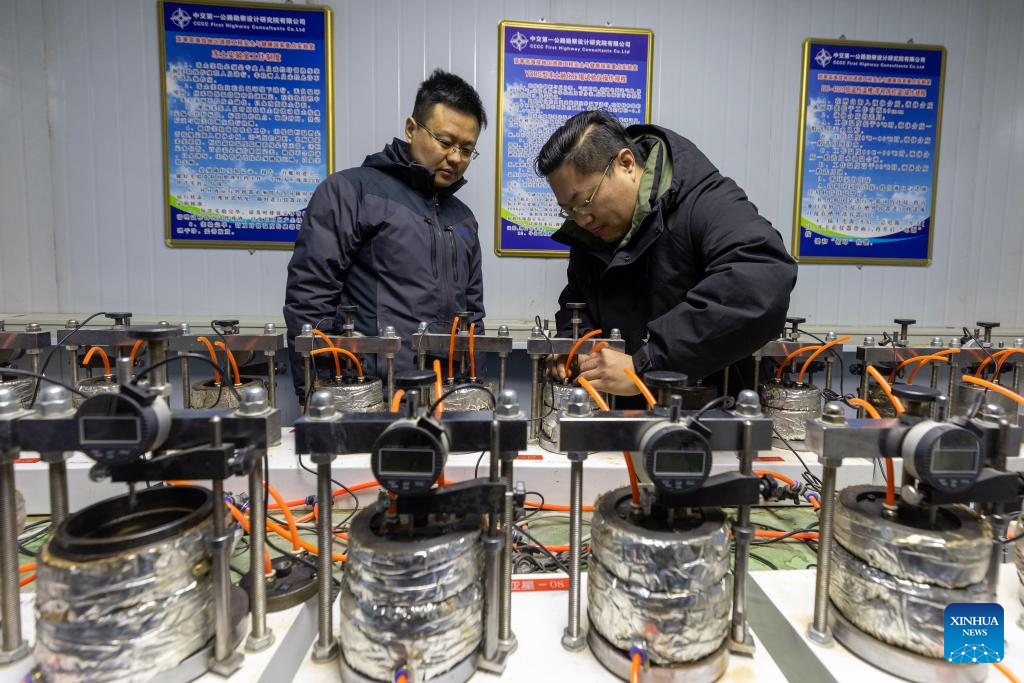 Chen Donggen (L), director of the Golmud observation and research base under CCCC First Highway Consultants Co., Ltd., a highway survey and design company, checks permafrost samples with a colleague in Golmud, northwest China's Qinghai Province, Dec. 3, 2024. (Xinhua/Jiang Fan)