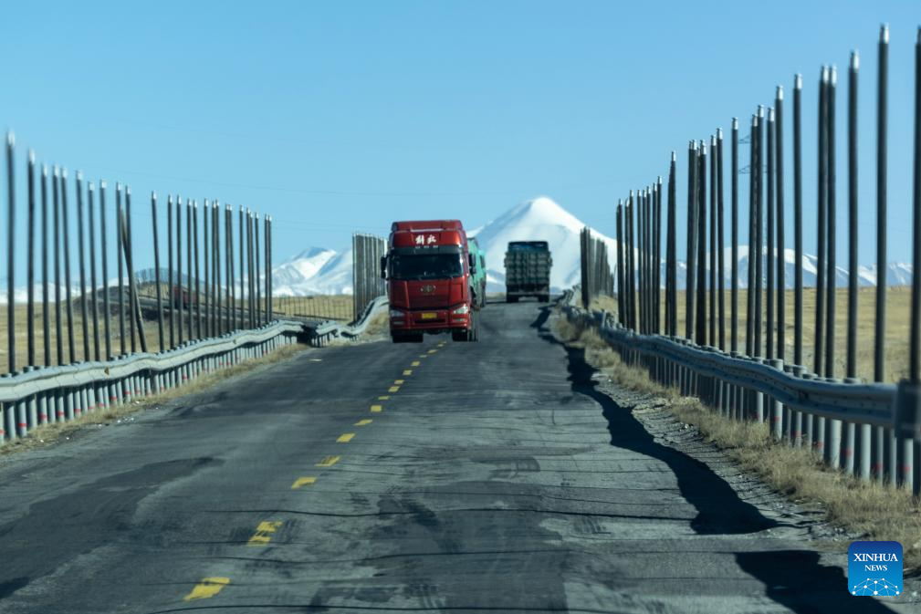 Trucks pass through a road section of the Qinghai-Xizang Highway built on permafrost flanked by metal pipes, which serve as conductive heat pipes to stabilize the temperature of the permafrost layer, on the Qinghai-Xizang Plateau in northwest China's Qinghai Province, Dec. 2, 2024. (Xinhua/Jiang Fan)