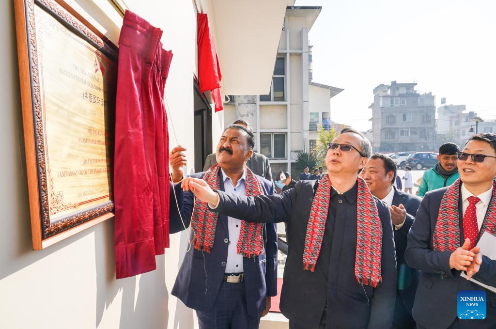 Raj Kumar Gupta (1st L, front), Nepal's minister for federal affairs and general administration, and Chinese Ambassador to Nepal Chen Song (C, front) unveil a plaque of a traditional Chinese medicine (TCM) international diagnosis and treatment center in Kathmandu, Nepal, Dec. 23, 2024. (Photo by Hari Maharjan/Xinhua)