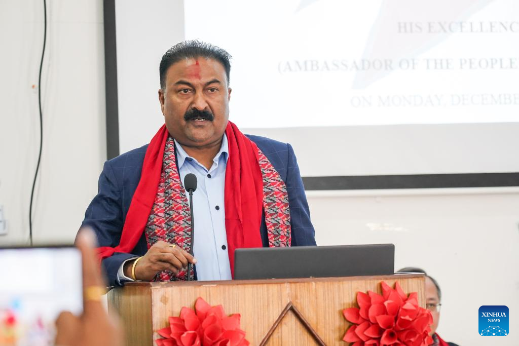 Raj Kumar Gupta, Nepal's minister for federal affairs and general administration, speaks at the inauguration ceremony of a traditional Chinese medicine (TCM) international diagnosis and treatment center in Kathmandu, Nepal, Dec. 23, 2024. (Photo by Hari Maharjan/Xinhua)