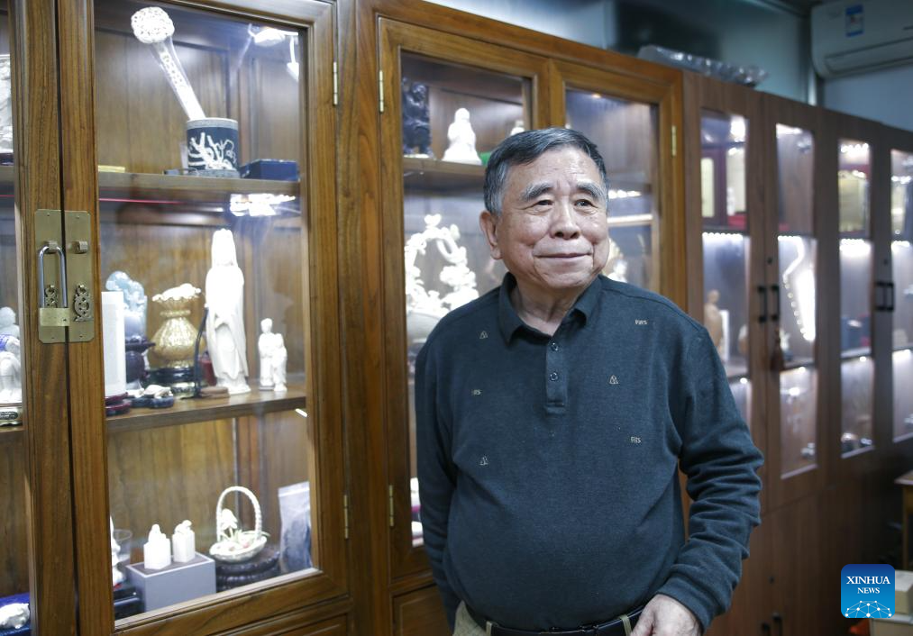 Li Chunke stands in front of the displaying cabinet of his artworks at his studio in Beijing, capital of China, Dec. 17, 2024. (Xinhua/Zhu Weixi)