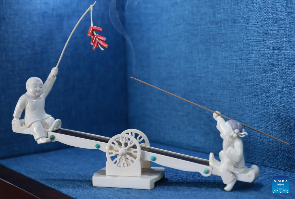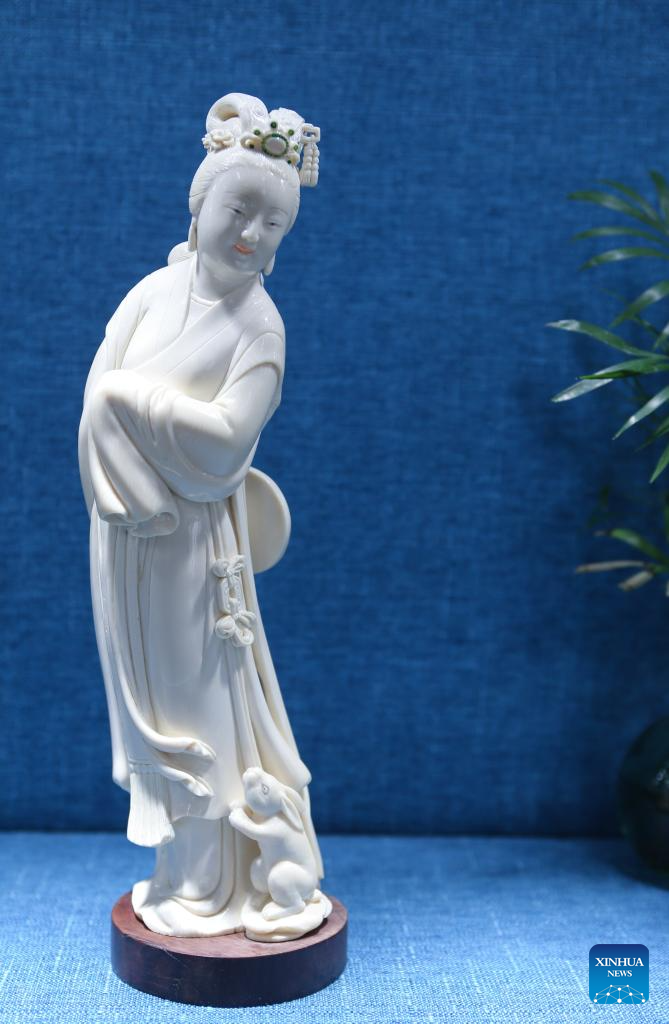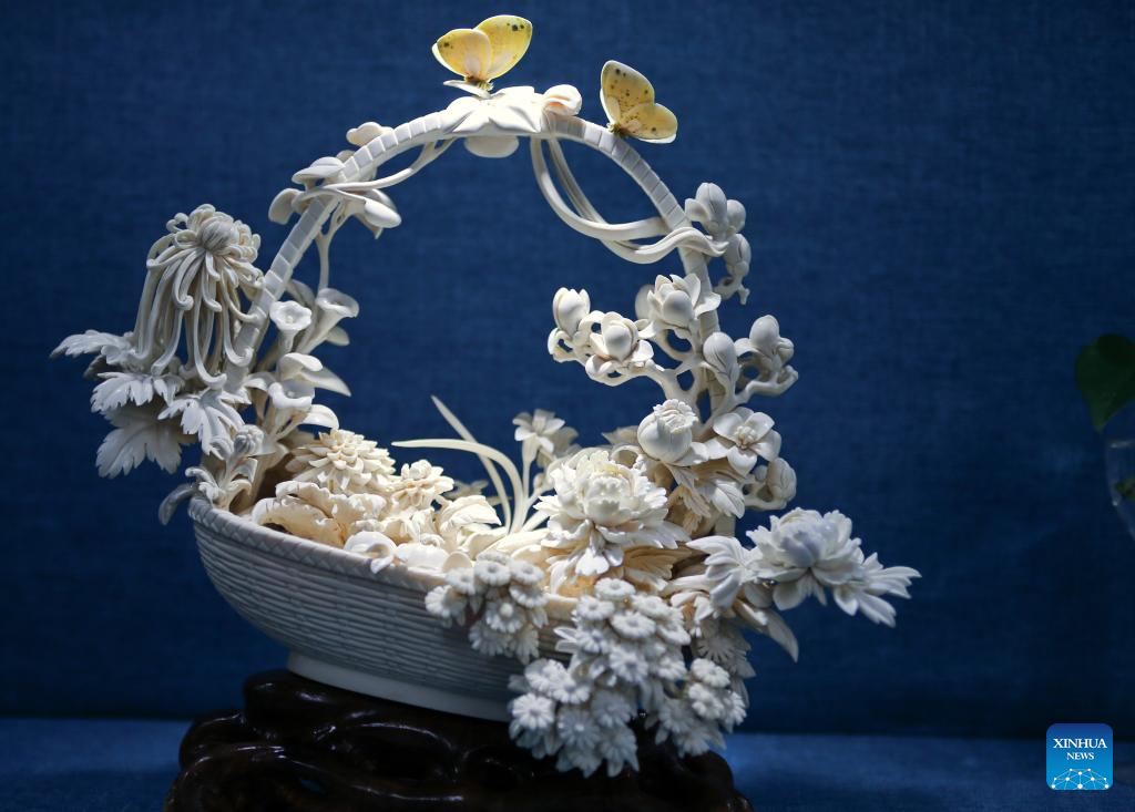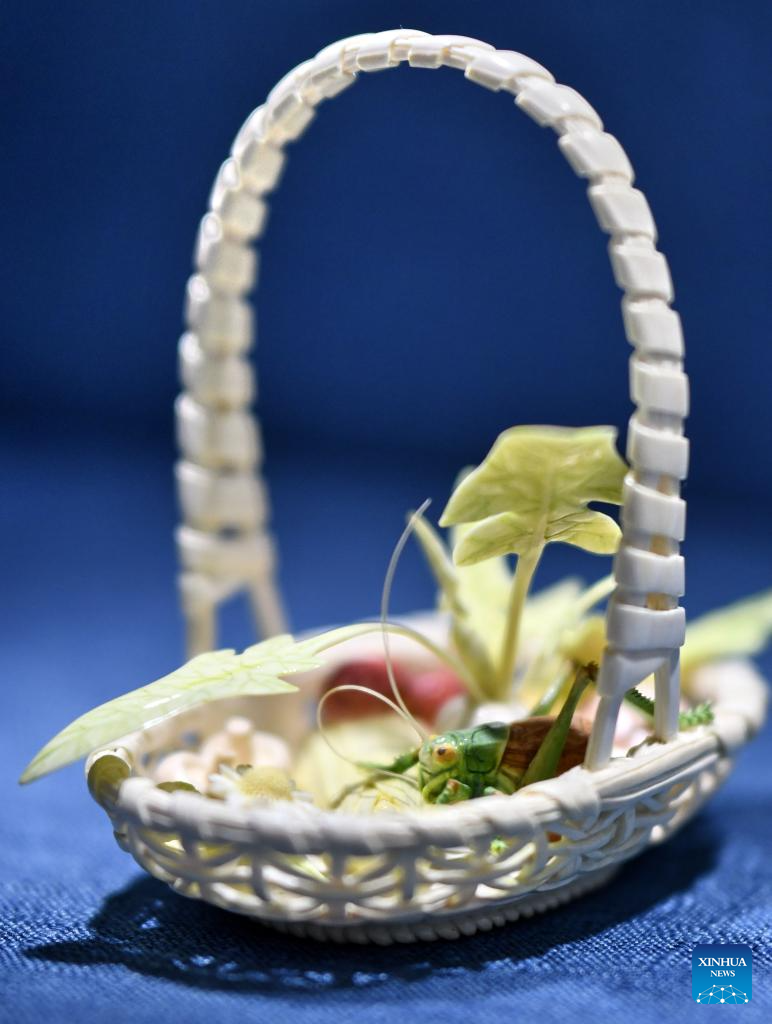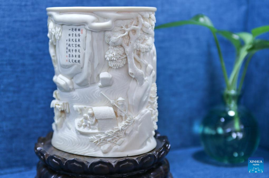 This photo taken on Dec. 17, 2024 shows a mammoth tusk carving artwork made with micro-carving skills displayed at the studio of Li Chunke in Beijing, capital of China. (Xinhua/Zhu Weixi)