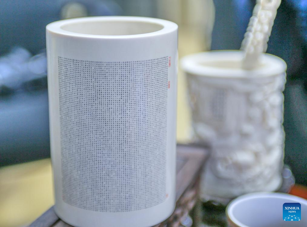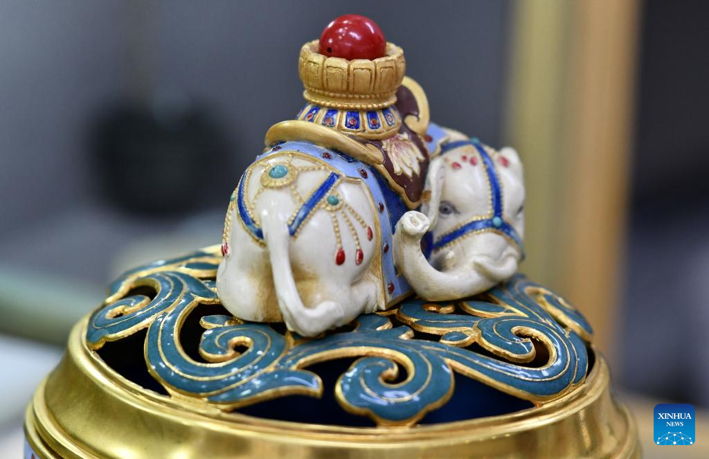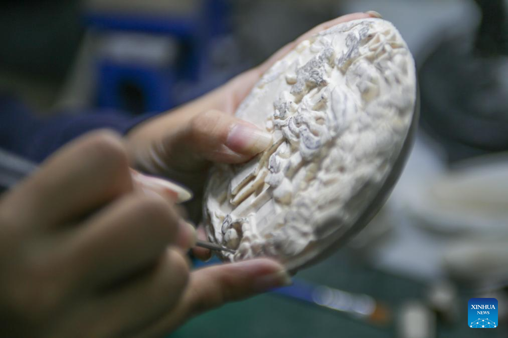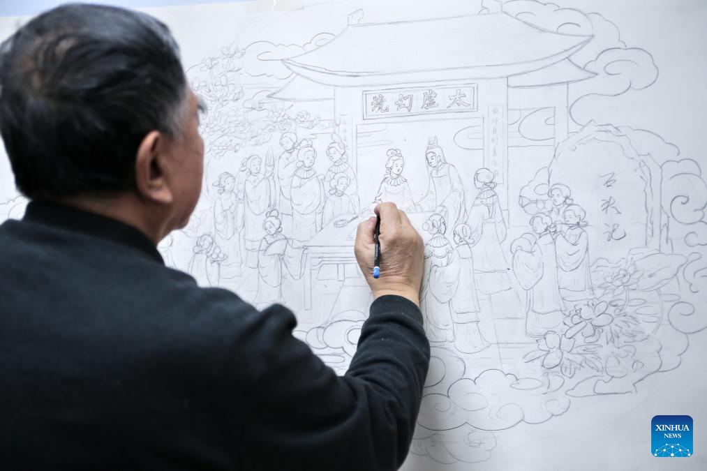 An apprentice of Li Chunke works at the studio of Li Chunke in Beijing, capital of China, Dec. 17, 2024. (Xinhua/Li Xin)