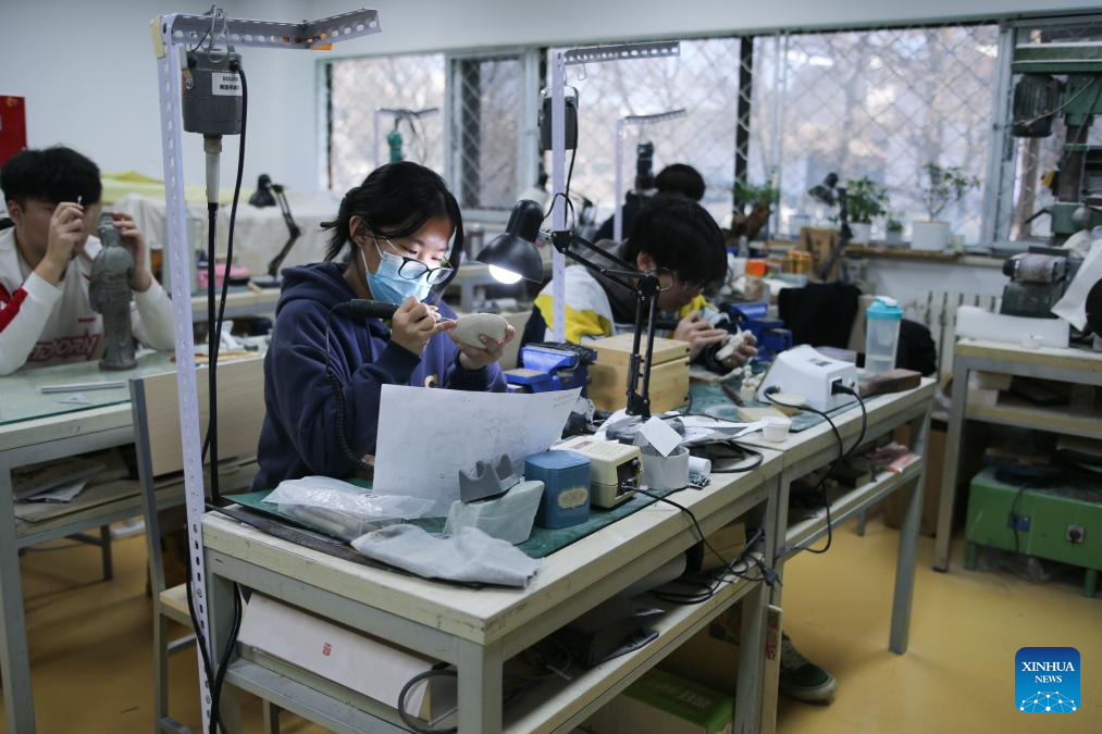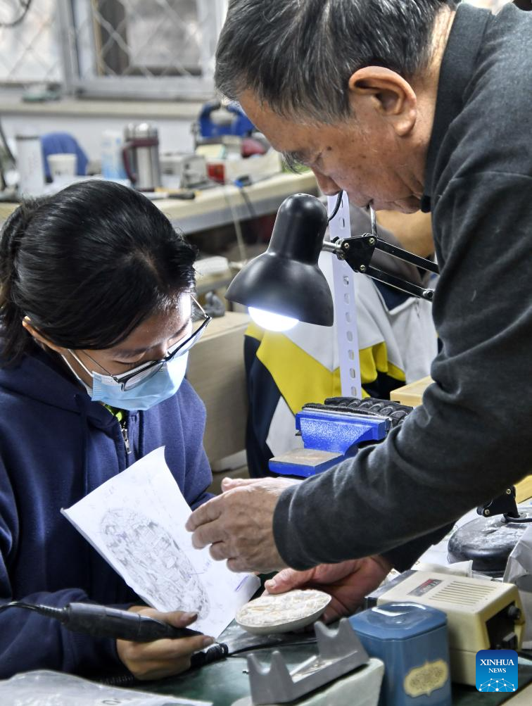 Apprentices of Li Chunke work at the studio of Li Chunke in Beijing, capital of China, Dec. 17, 2024. (Xinhua/Zhu Weixi)