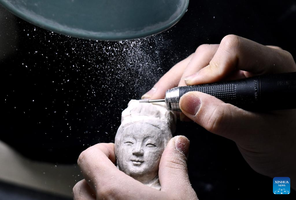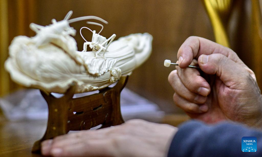 Li Chunke makes a mammoth tusk carving artwork at his studio in Beijing, capital of China, Dec. 17, 2024. (Xinhua/Li Xin)