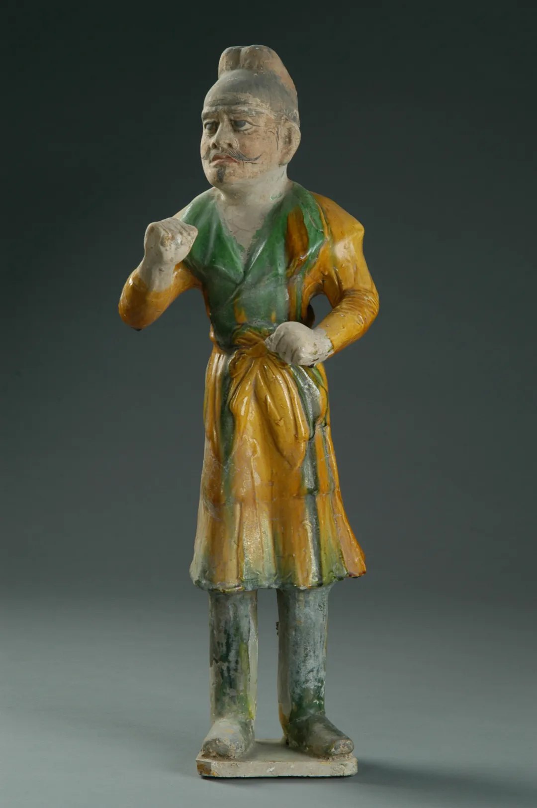 A tri-colored glazed pottery sculpture from the Tang Dynasty (618-907), which depicts a man who leads camels, is called the "fashion icon" of ancient cultural relics due to his colorful clothes.