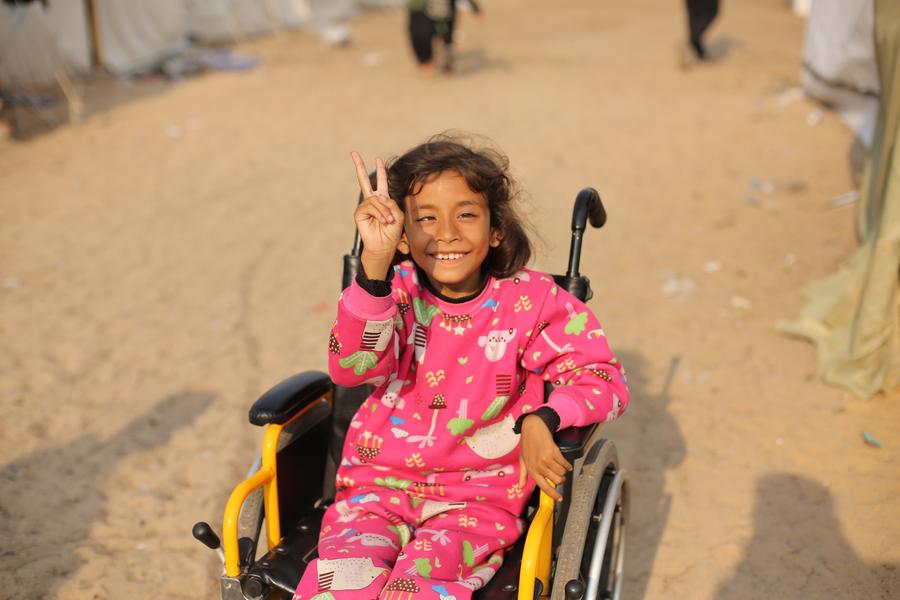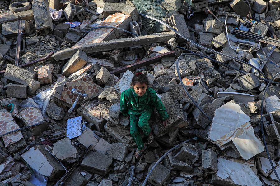 A Palestinian child is seen on the rubble in the southern Gaza Strip city of Rafah, Jan. 27, 2024. (Photo by Rizek Abdeljawad/Xinhua)